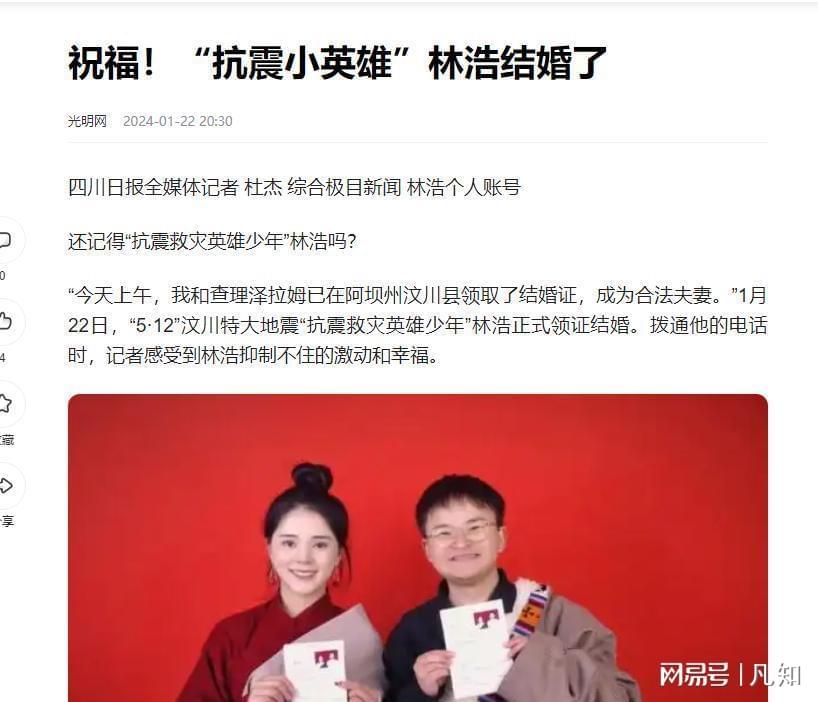 信息来源:祝福!“抗震小英雄”林浩结婚了