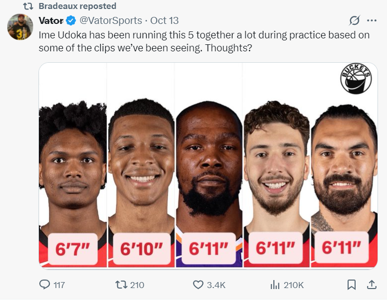 本场比赛,火箭队主教练乌度卡大胆变阵,派出了一套平均身高超过2.08米的先发阵容,包括阿门(2.01米)、小贾巴里(2.08米)、杜兰特(2.11米)、申京(2.11米)和亚当斯(2.11米)。首节比赛,小贾巴里手感火热,单节砍下11分,但杜兰特手感不佳,4投0中,三分球2投0中。阿门作为先发控卫,贡献7分3助攻。首节结束,火箭仅以26-28落后2分。