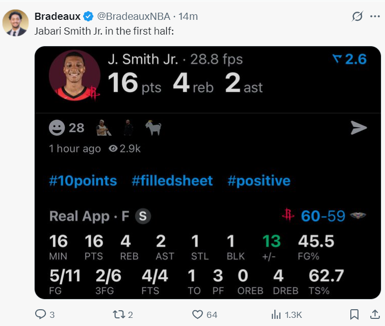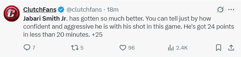 赛后,休斯顿当地媒体ClutchFans对小贾巴里的表现给予了高度评价:“小贾的进步非常巨大,从这场比赛就能看出他的自信与积极态度。他在不到20分钟的时间里就拿到了24分,在场正负值高达+25。这样的表现,无疑让我们对他的未来充满了期待。”
