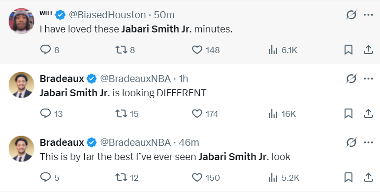 休斯顿媒体和球迷们对小贾巴里的表现赞不绝口:“我一直很喜欢看到小贾有充足的登场时间,他看起来已经与众不同了。”“这绝对是我见过最强最帅的史密斯。”这样的评价,无疑是对小贾巴里努力的最好肯定。