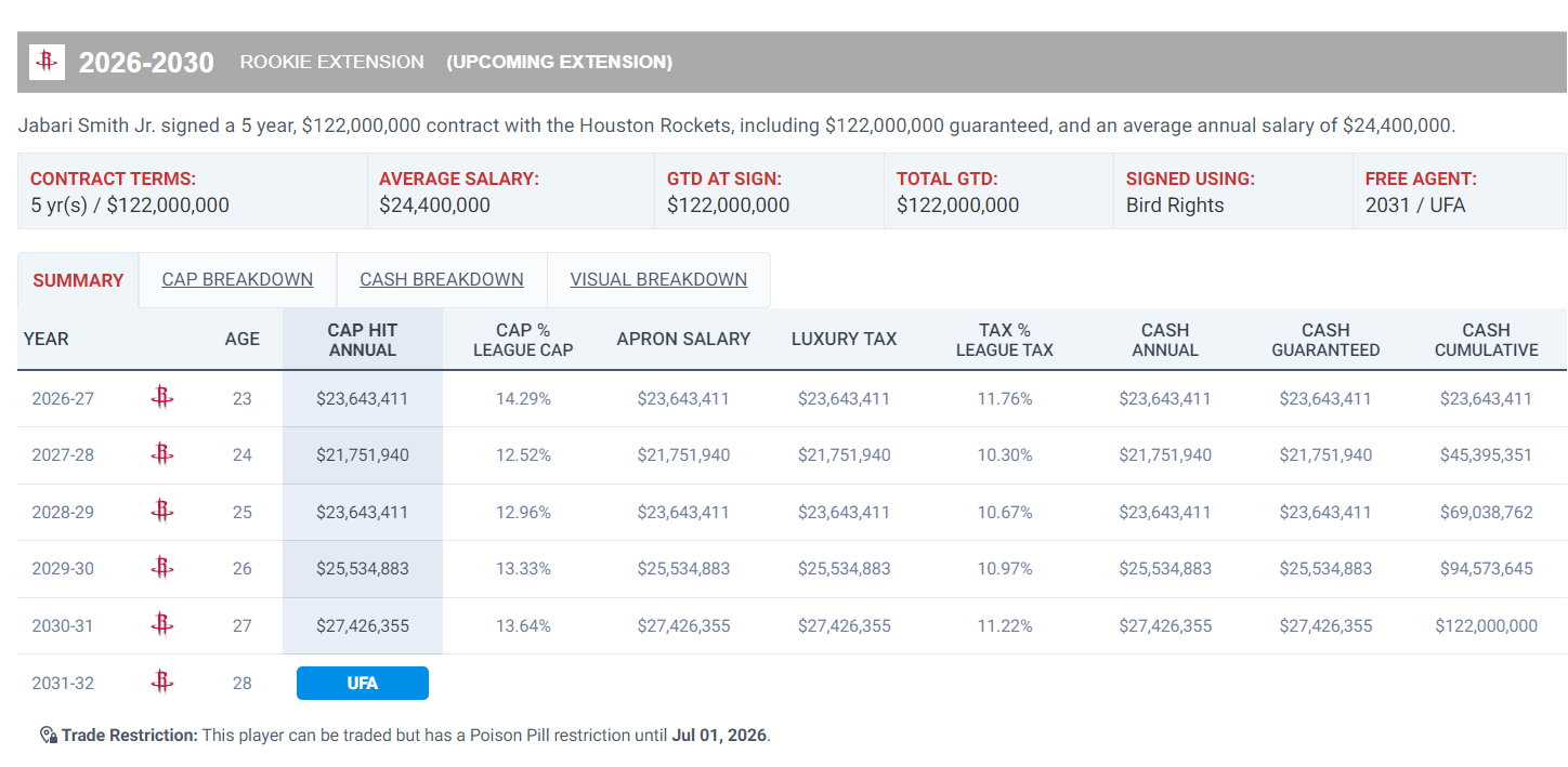 值得一提的是,小贾巴里在今年夏天与火箭队签下了一份五年1.22亿美元的提前续约合同。考虑到他新秀赛季还剩最后一年,这份合同的均薪仅为2440万美元。如今看来,火箭队总经理斯通无疑又完成了一笔超值的签约。正如申京的五年1.85亿美元合同一样,小贾巴里的这份合同也有望成为火箭队未来的宝贵财富。