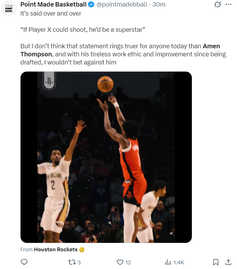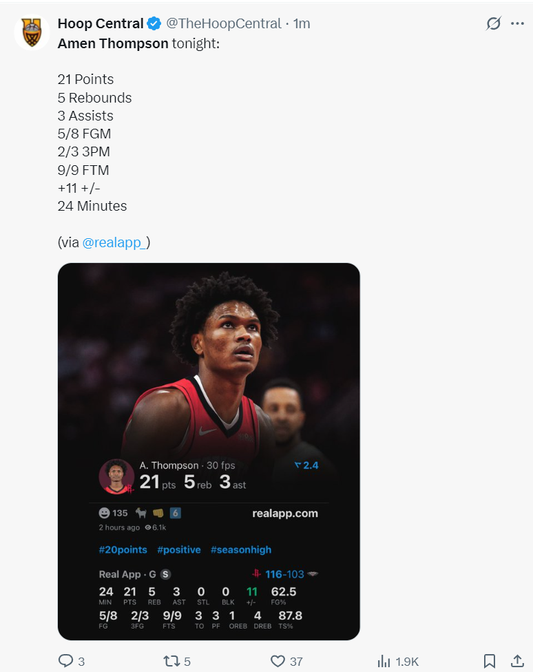 美国媒体PMB点评道:"自加盟火箭以来,阿门-汤普森始终在提升投射能力,这场比赛的持球三分证明他的努力正在转化为赛场统治力。如果他能保持这种进步态势,成为联盟超级巨星只是时间问题。"