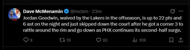另一位NBA知名记者Dave McMenamin也对古德温的表现赞不绝口。他写道:“乔丹·古德温在休赛期被湖人队裁掉,但今晚他用自己的行动回应了质疑。他得到22分和6次助攻,在底角投中三分球后,一路冲过球场,在篮筐周围飞奔而下,凤凰城队也因此在他的带领下继续在下半场发起猛攻。”
