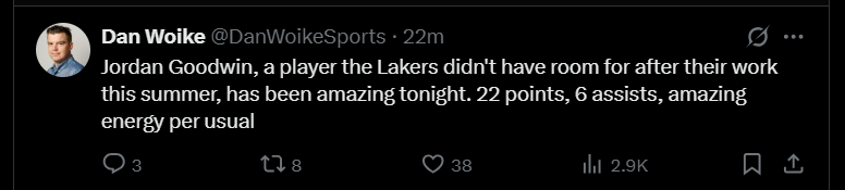 古德温的出色表现也引起了媒体和记者的广泛关注。湖人随队记者Dan Woike在赛后评论道:“乔丹·古德温,这位在湖人队今夏重组后无处容身的老将,今晚的表现简直惊艳。他砍下22分并送出6次助攻,一如既往地充满活力,仿佛在向世界证明自己的价值。”