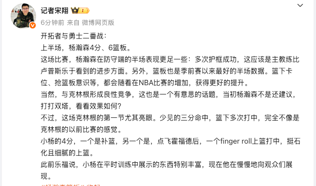 上半场战罢,杨瀚森虽然仅出战9分钟,但却高效地砍下了4分并摘下6个篮板,展现出了不俗的竞技状态。他的出色表现也引起了媒体人的广泛关注,其中媒体人“宋翔”便发文对杨瀚森的表现进行了点评。