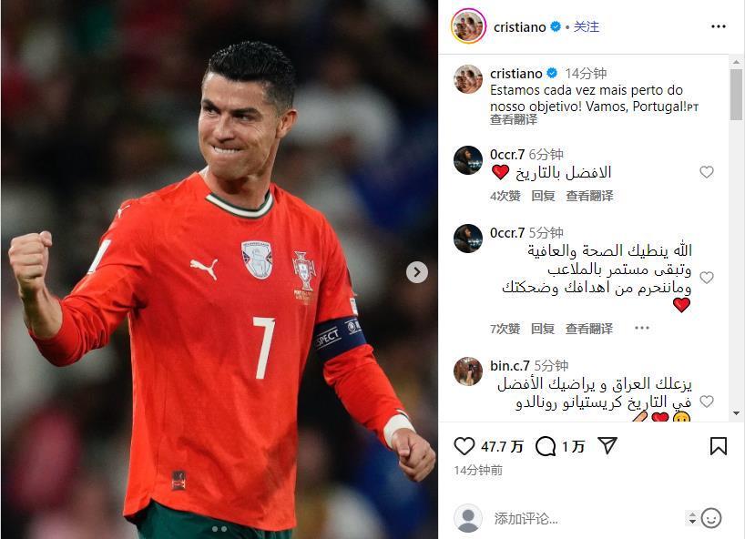 尽管葡萄牙队在比赛最后时刻被对手逼平,未能提前锁定晋级名额,但C罗在赛后第一时间通过社交媒体为全队注入信心。他在个人账号发布动态称:"我们离目标越来越近了!加油,葡萄牙!"配以葡萄牙国旗和加油手势的表情符号,展现出领袖球员的担当。