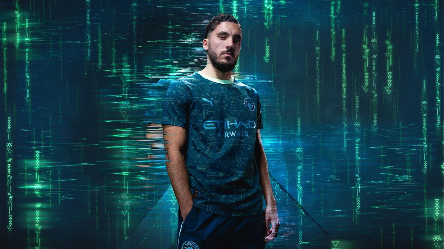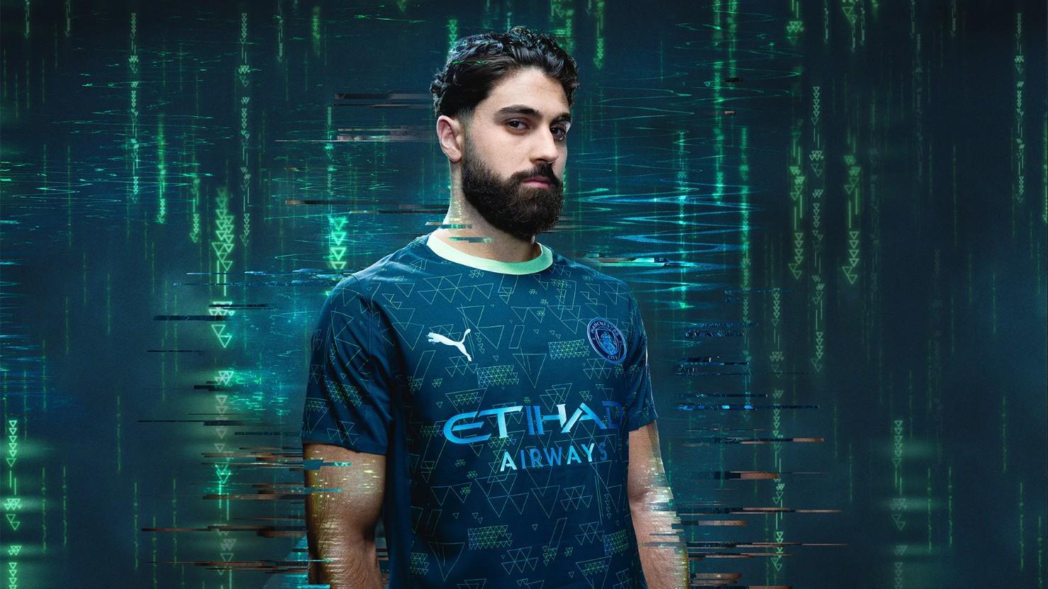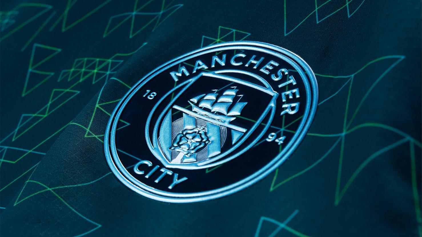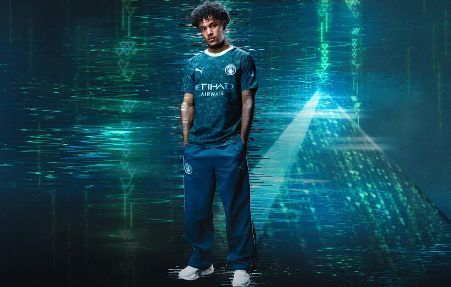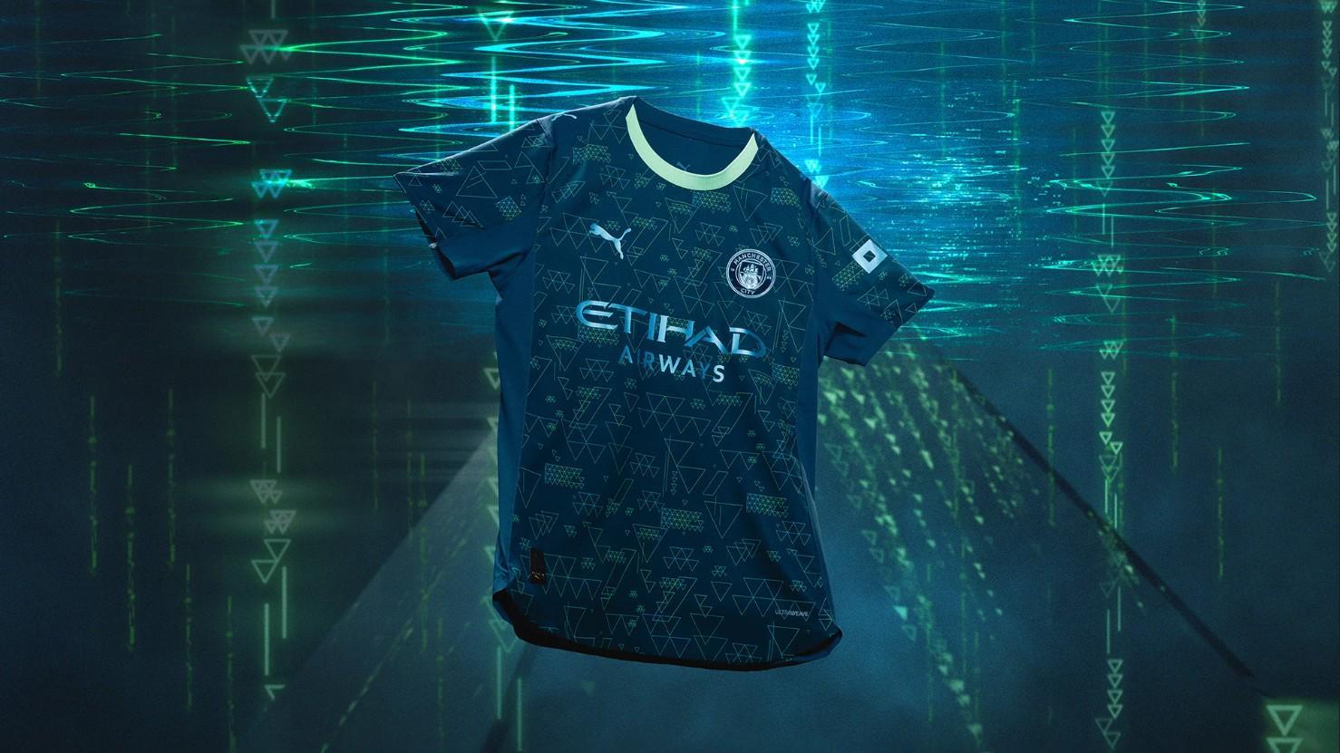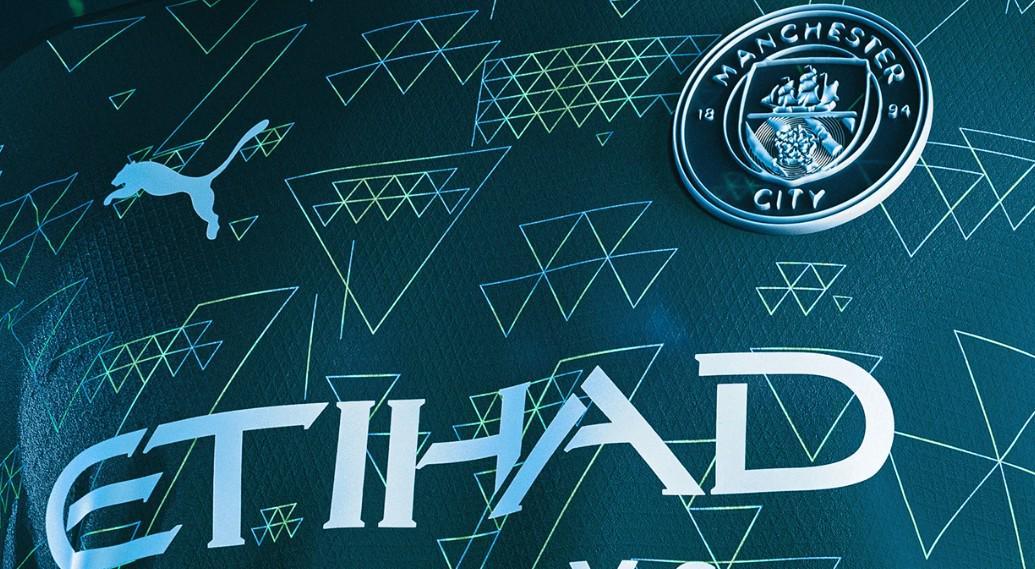 深森林绿色的底色上,点缀着青绿色和金属色的三角形图案,浅绿色的圆领设计增添了时尚感。金属色的PUMA标志和位于曼城队徽中心的NFC芯片,都清晰可见,彰显了球衣的独特魅力。