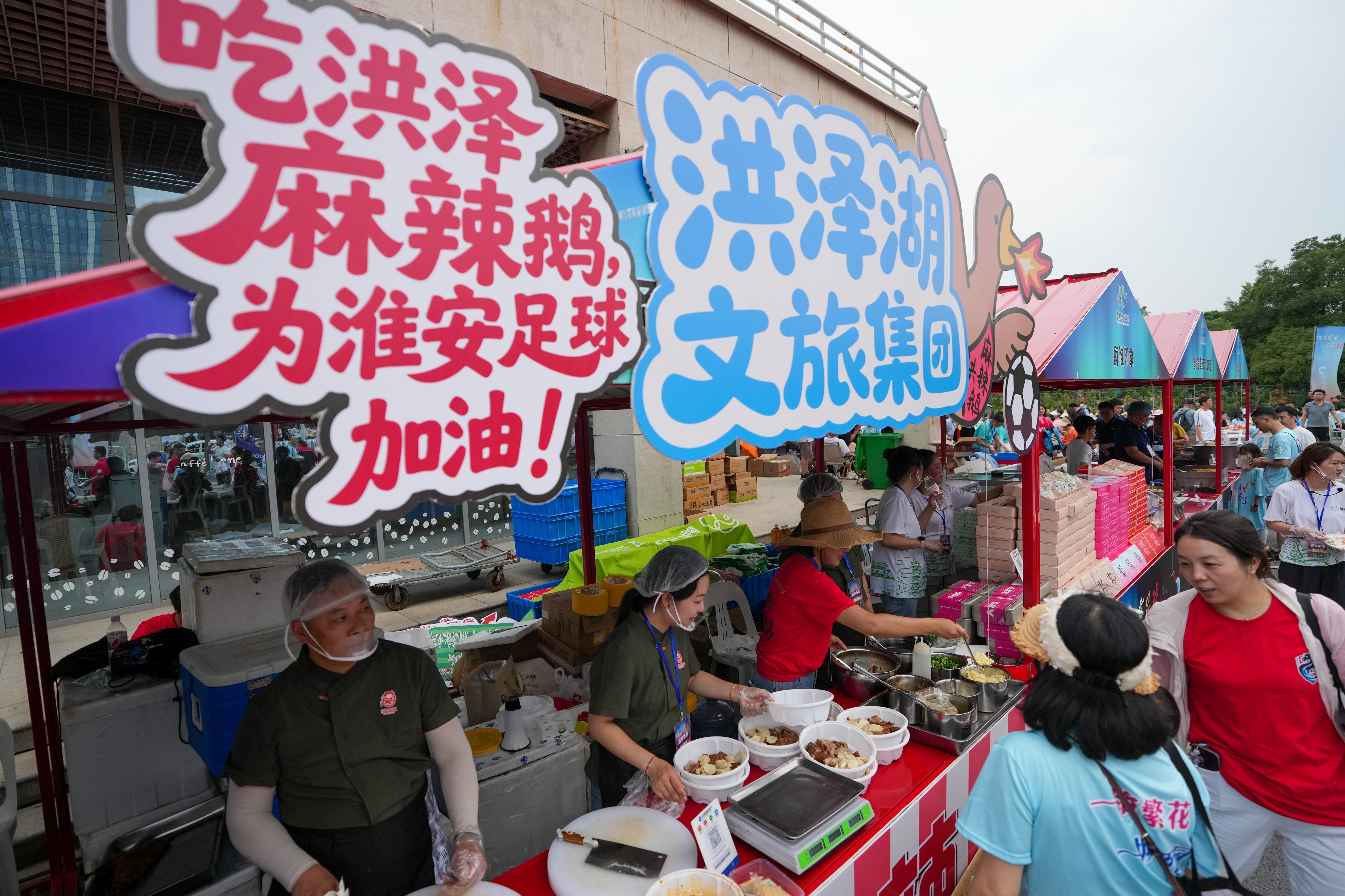 (6月14日,球迷在江苏淮安“苏超”市集选购各类美食特产。新华社图片)