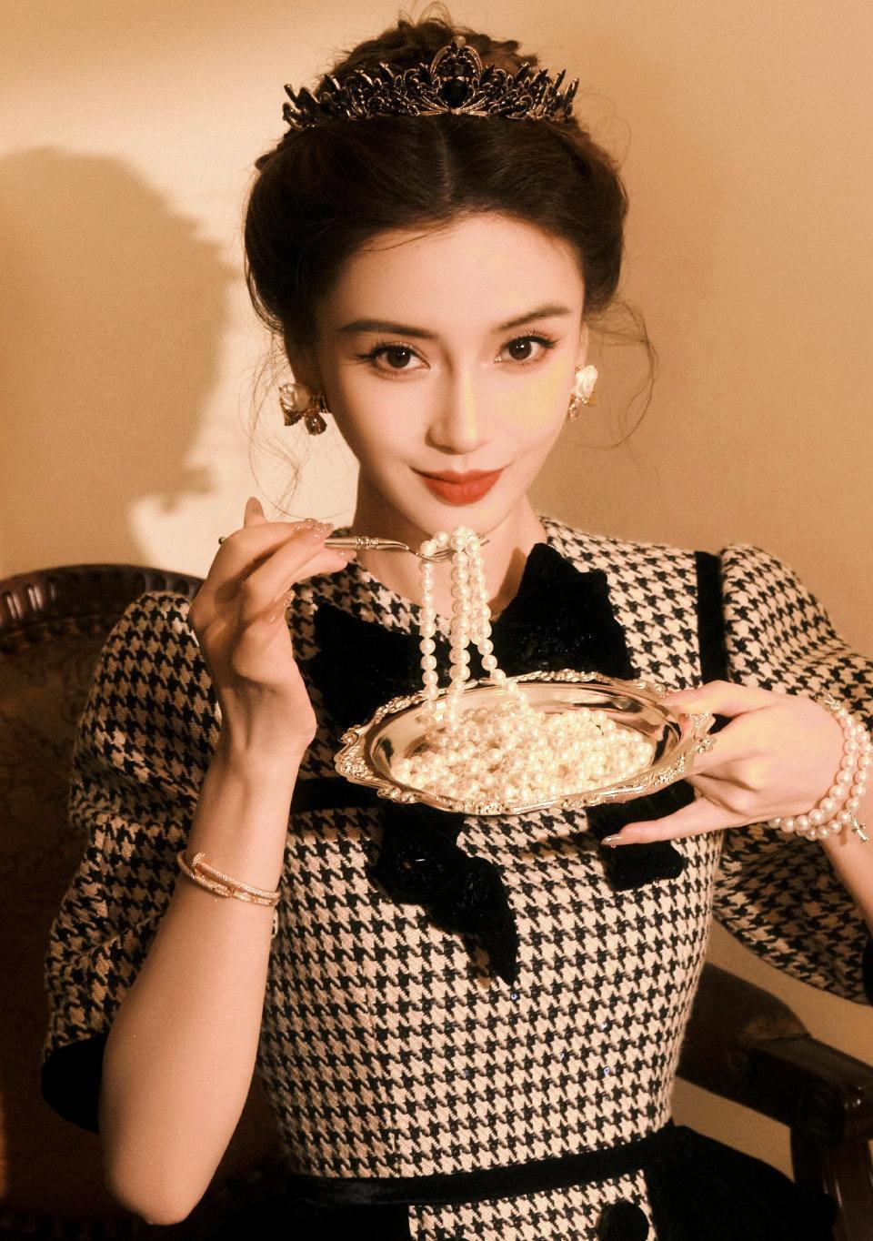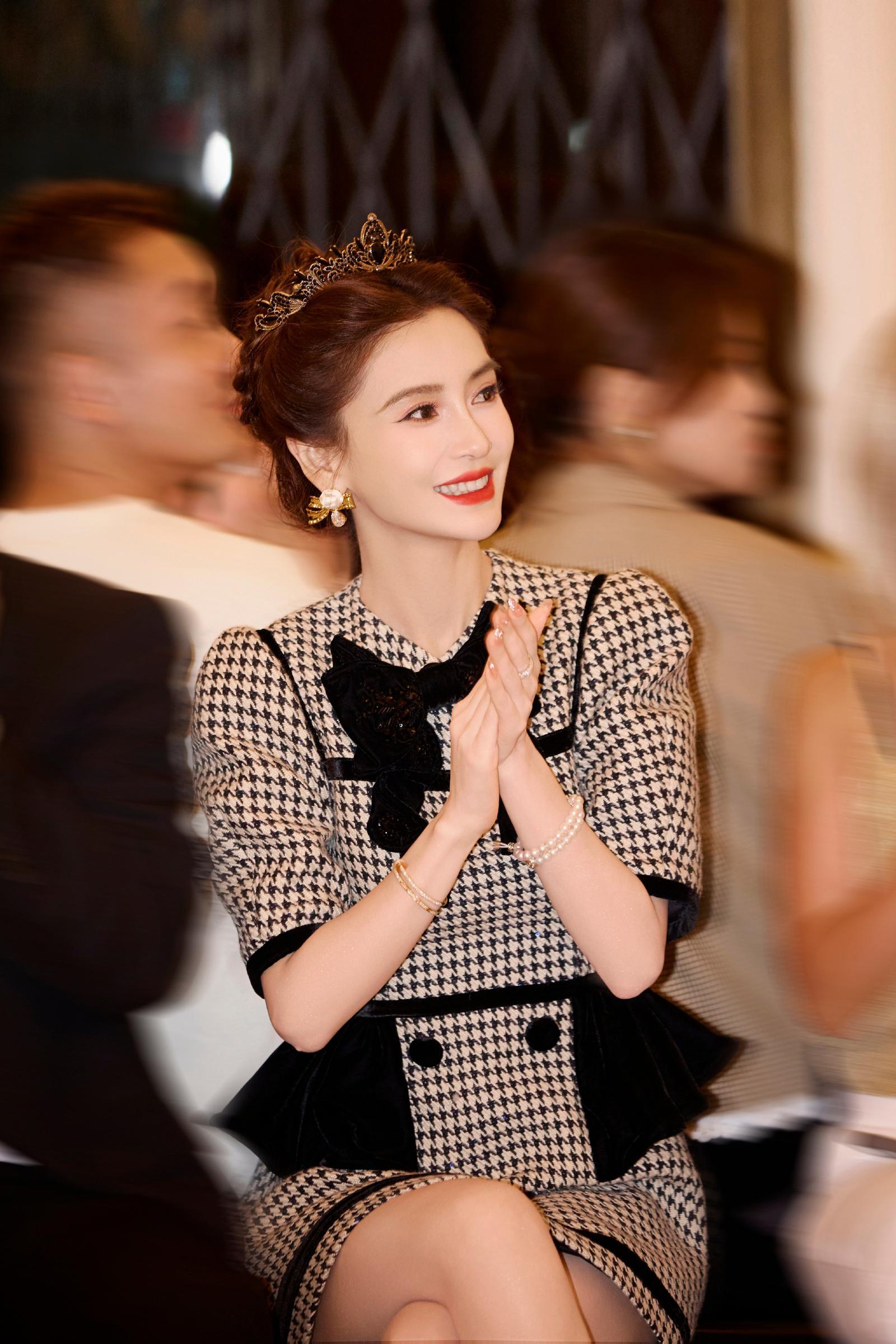当天,她身穿黑白千鸟格高定套裙,头戴钻石皇冠,一身装扮贵气十足。