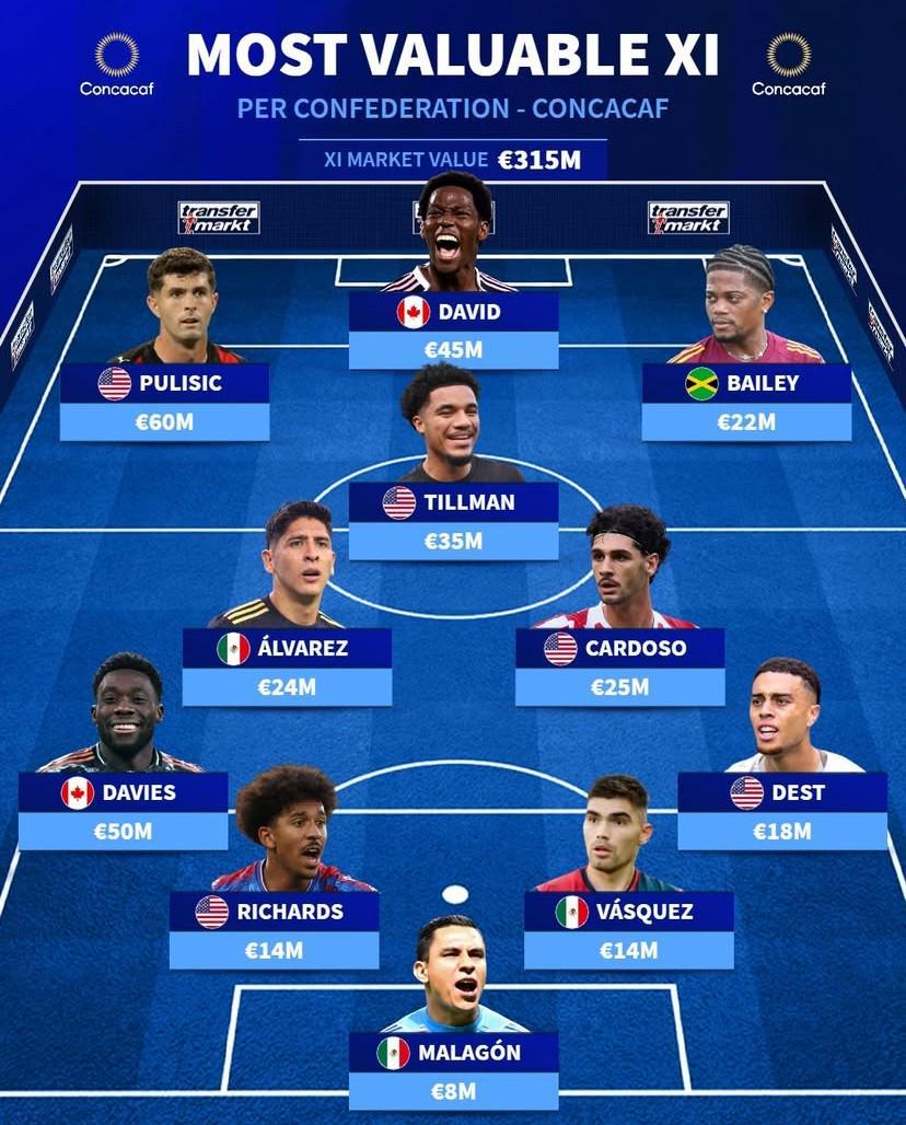 阵容总身价达3.15亿欧元,创下该地区历史新高。这份榜单不仅反映了当前中北美洲球员在欧洲五大联赛的广泛影响力,也凸显了普利希奇、阿方索-戴维斯等球星在全球足坛的竞争力。