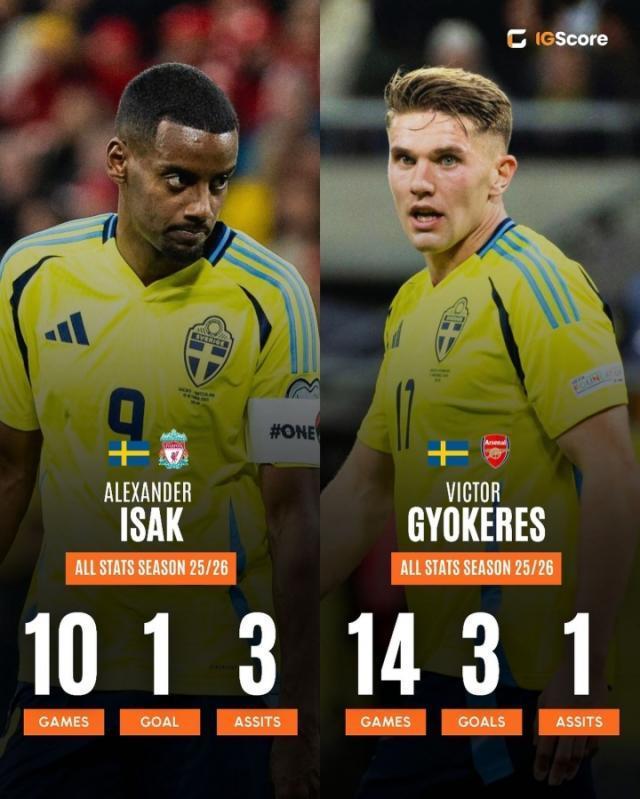 10月15日讯 本期国际比赛日窗口,瑞典在世预赛中0比2瑞士、0比1科索沃,遭遇两连败,伊萨克和约克雷斯一球未进。今年夏窗,瑞典队内两位头牌球员约克雷斯和伊萨克都遭遇了转会肥皂剧,约克雷斯在葡体罢训近3周,最终以6580万欧元的转会费加盟阿森纳;伊萨克更是直到夏窗最后一刻才以1.45亿欧元加盟利物浦,错过了几乎整个夏季备战期。本赛季约克雷斯代表阿森纳和瑞典国家队出战14场比赛,贡献3粒进球和1次助攻,目前他的德转身价为7500万欧元;伊萨克则代表利物浦和瑞典出战10场比赛,贡献1粒进球和3次助攻,德转身价1.2亿欧元。