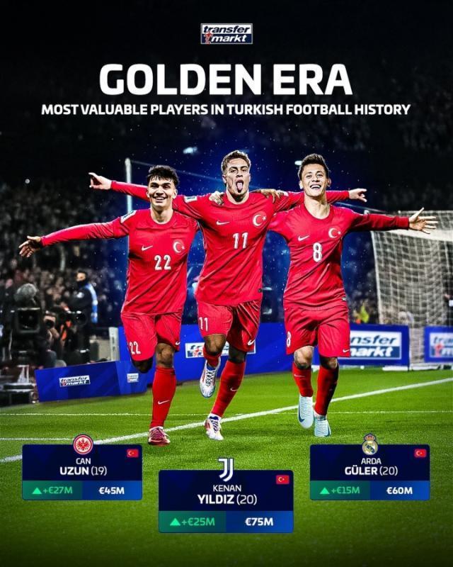10月15日讯 此次德转身价更新后,三名土耳其新星伊尔迪兹、居莱尔和乌尊身价均迎来暴涨,三人的身价目前为土耳其球员历史前三名。