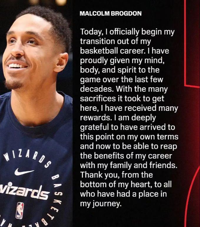 距离NBA新赛季开幕仅剩6天,一则突发消息震惊了整个篮球界。据名记沙姆斯·查拉尼亚报道,球队后卫马尔科姆·布罗格登通过ESPN正式宣布退役决定,结束了自己长达九年的NBA职业生涯。这一突如其来的消息,让无数球迷和业内人士感到意外。