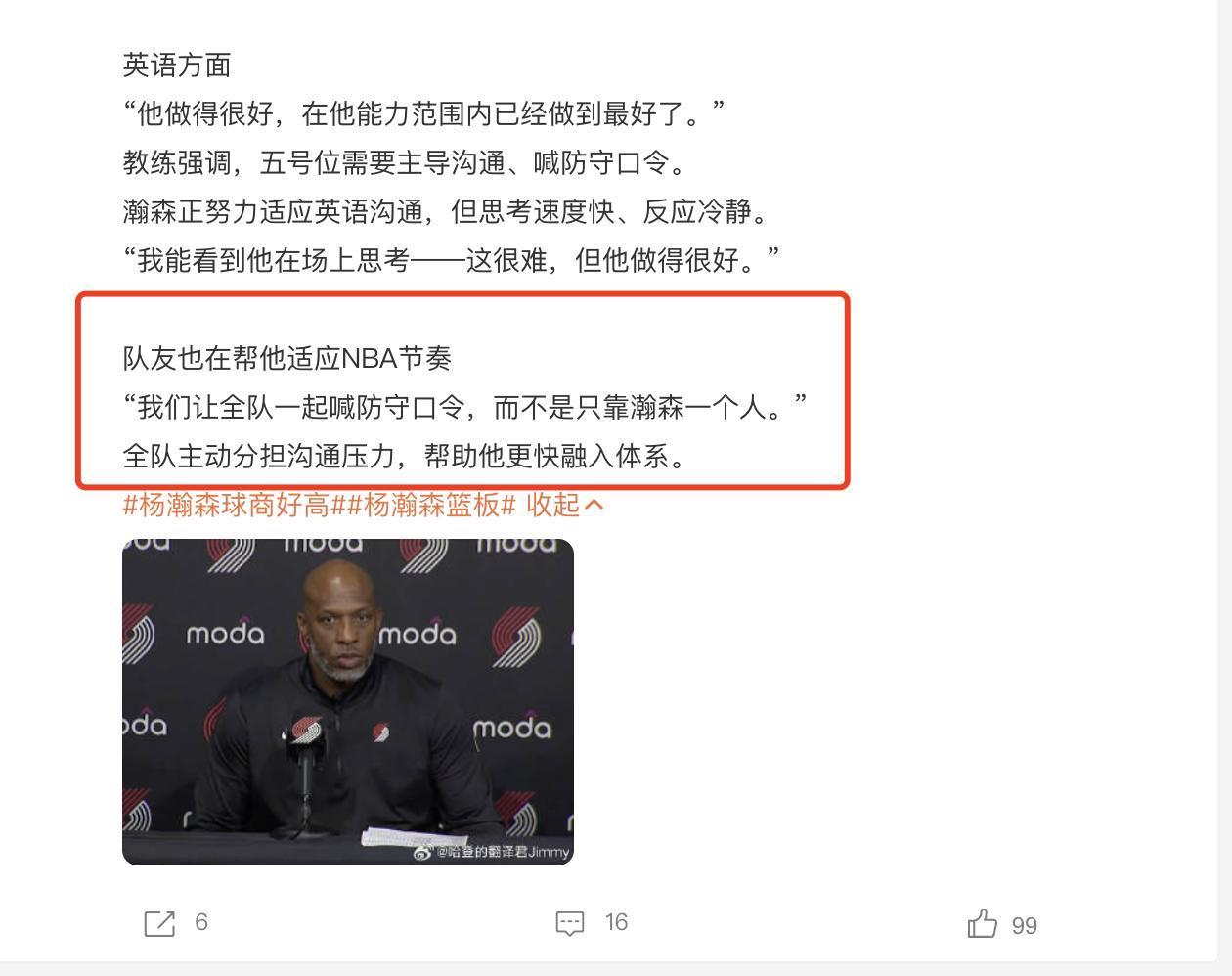 杨瀚森用实际行动证明了自己的适应力。他性格活泼外向,在球队中主动与教练、队友交流,与老大哥们的相处也十分融洽。而在最近三场季前赛结束后,更是传来了令人振奋的消息:杨瀚森在开拓者队有了“大哥”的全力支持。