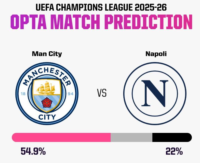 对于即将到来的这场对决,知名数据机构Opta也给出了预测。根据他们的分析,曼城本场赢球的概率高达54.9%,而那不勒斯赢球的可能性则仅为22%,平局的概率则为23%。