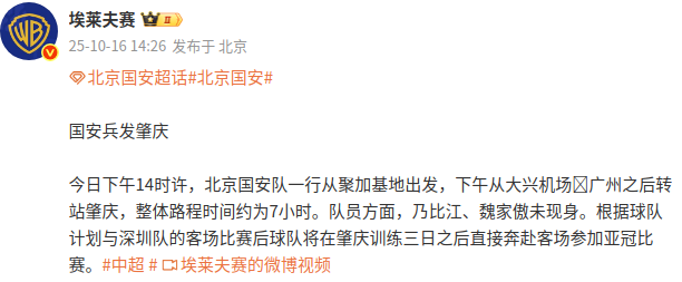 据悉,北京国安队一行于今日下午14时左右从聚加基地出发,搭乘航班从大兴机场飞往广州,随后转站肇庆。整个行程预计耗时约7小时。然而,在出征的队伍中,并未见到乃比江和魏家傲的身影,两位球员此次并未随队出征。