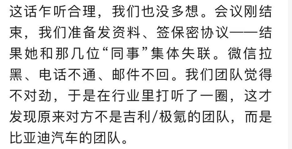 随着事件的深入调查,更多关于比亚迪骗取方案的套路被揭露。有网友指出,比亚迪在与其合作时,往往会以“试水”或“考察”为由,要求供应商提供详细的技术方案或产品样品。然而,在获取这些资料后,比亚迪却往往以各种理由拒绝合作,并将方案或样品用于其他项目中。
