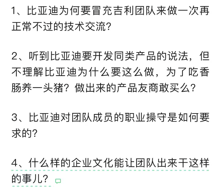随着事件的发酵,网友们对比亚迪的行为提出了四连问:为何要骗取供应商方案?骗取方案后如何使用?是否考虑过供应商的感受?这种行为是否符合商业道德?这些问题直指比亚迪的核心,也让其陷入了前所未有的舆论危机。