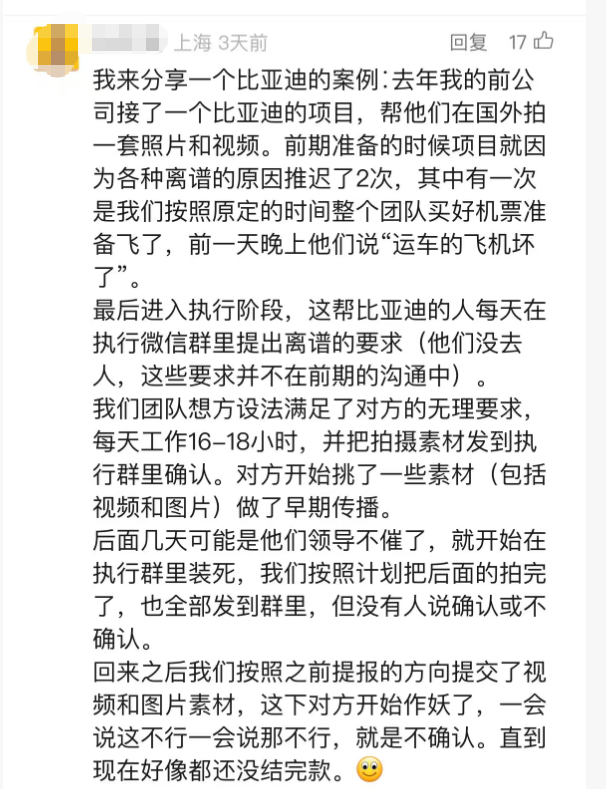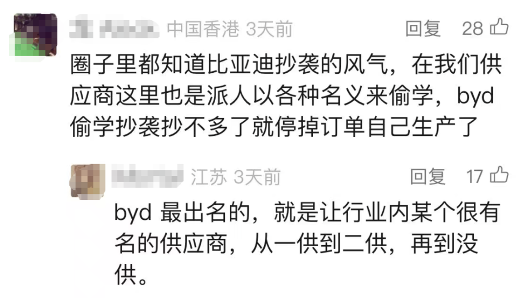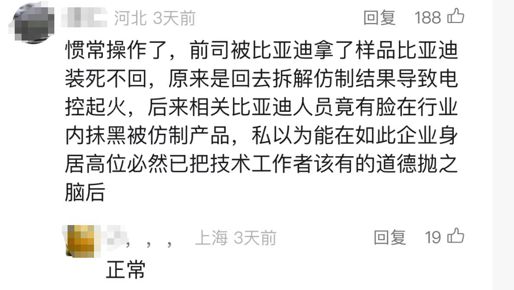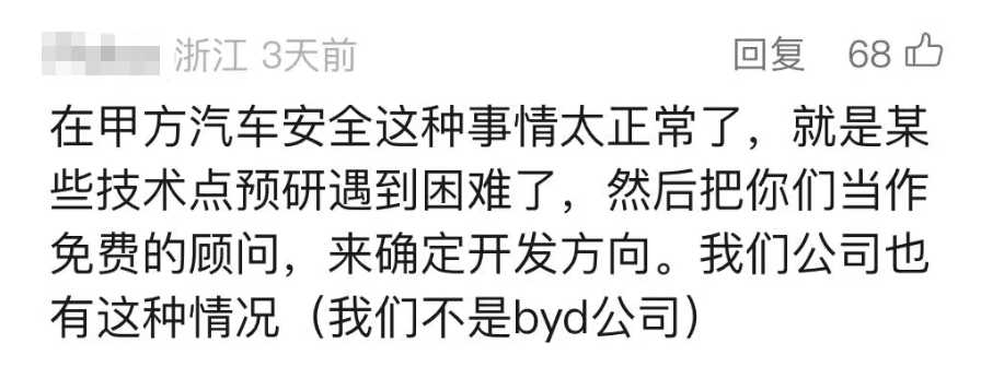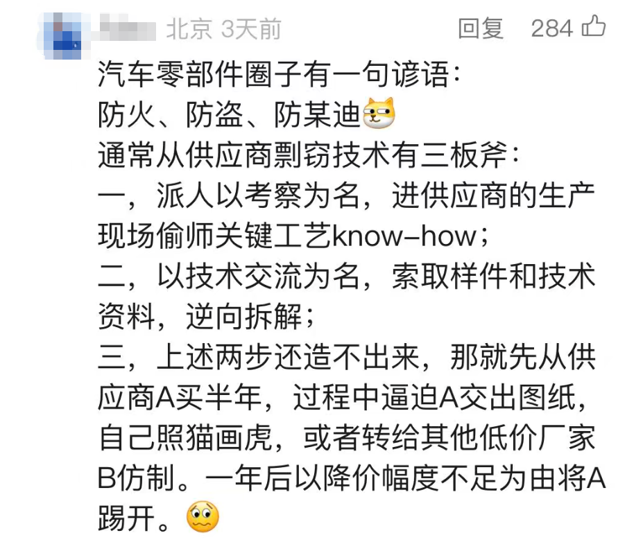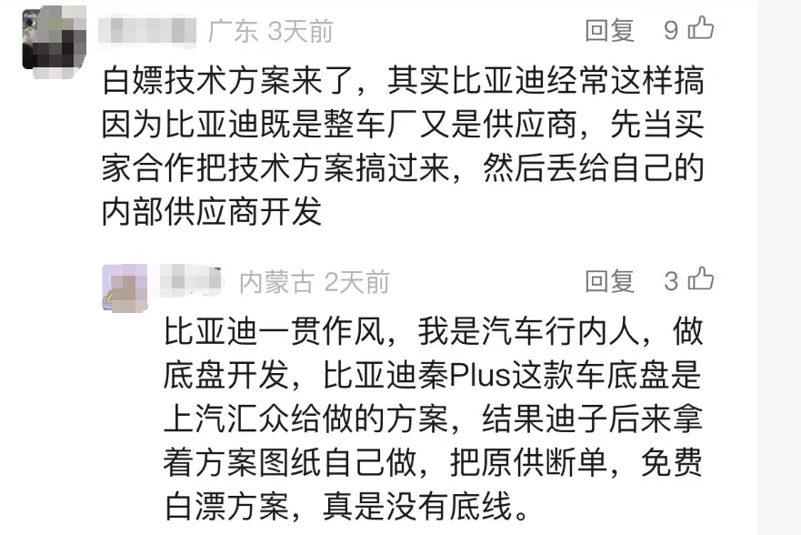 很快,其他网友在评论区纷纷表示,比亚迪骗取供应商方案的行为并非首次,而是早已成为行业内的“惯例”。这一说法让比亚迪的声誉雪上加霜,也引发了更多供应商的共鸣与爆料。