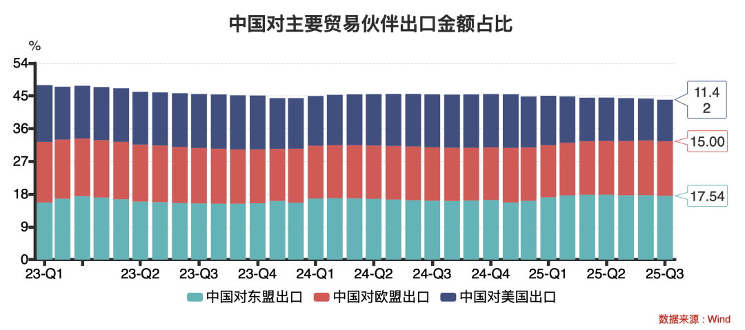 支撑中国硬气反制的背后,是中美双边贸易格局正在发生的结构性转变。最新数据显示,2025年9月中国对美出口额同比下降27.03%,8月单月跌幅更高达33.1%,创下2020年以来最大单月跌幅。美国在中国出口总额中的占比已降至11.42%,从长期占据的第一大出口市场滑落至第三位,次于东盟(17.54%)和欧盟(15%)。