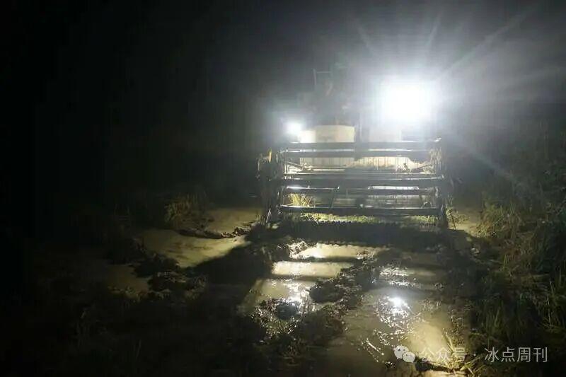 只要不下雨,收割机就忙个不停。村里一位开收割机的师傅,有时下午两点才吃上午饭,有时到晚上十一二点,收割机还在田里熬夜,机顶照明灯像萤火虫一样,在漆黑一片的田野闪烁着,等待颗粒归仓的农民和载货的拖拉机也都陪在一旁。