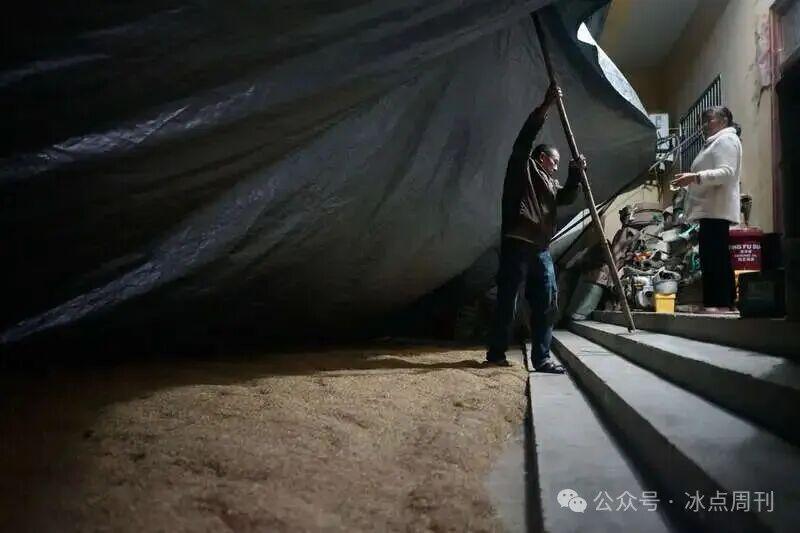 那些用不上烘干机的庄稼人,也想着各自的办法,展开自救。他们频繁地看天气预报,见缝插针地四处晾晒——院子里、房顶上、公路旁、广场上。许多农民在院子内外都搭起遮雨棚,雨停就掀开晾,雨来就盖上,有地方漏水,就拿出家里大大小小的盆接着。把粮食堆在屋里的,有的搬出风扇吹,有的在家中烧一盆火。
