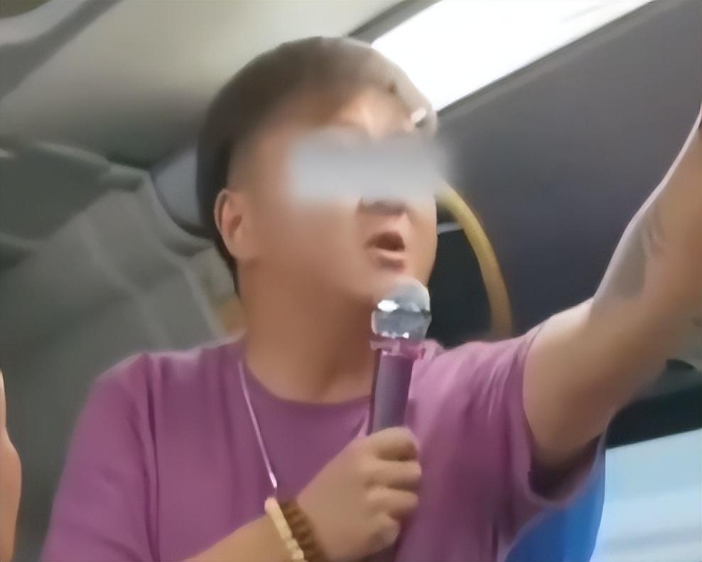 视频中,只见一个身穿紫色短袖,染着黄色头发的年轻男子拿着话筒在大巴车上喊道: