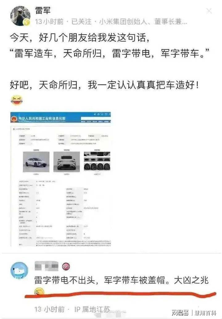 雷军的回应方式颇为艺术,他在社交媒体上发帖称:“今天,好几个朋友给我发这句话‘雷军造车,天命所归,雷字带电,军字带车’。”随后,他表示:“好吧!天命所归,我一定认认真真把车造好。”