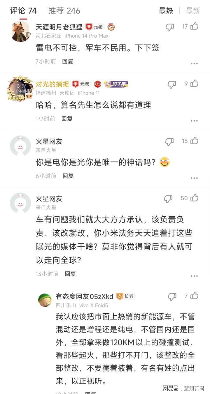 然而,雷军的回应并未平息争议,反而引发了更多讨论。有粉丝在他的帖子下回应:“雷字带电不出头,军字带车被盖帽。大凶之兆。”这显示出,雷军并未直接回应事故本身,而是强调了“造车是他的天命”。