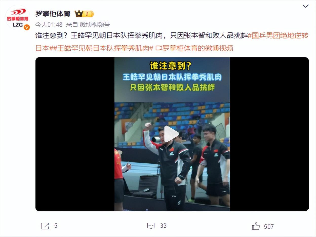 王皓还对着日本男队那个方向握拳,似乎是在回应张本智和当初的挑衅。