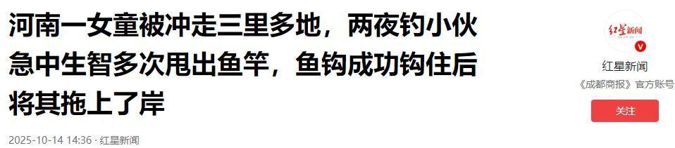 红星新闻-2025-10-14——《河南一女童被冲走三里多地,两夜钓小伙急中生智多次甩出鱼竿,鱼钩成功钩住后将其拖上了岸》