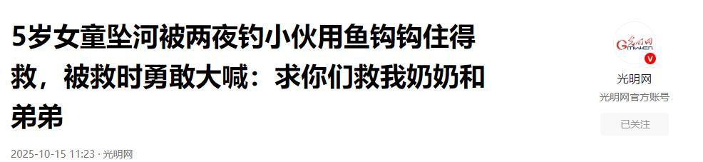 光明网-2025-10-15——《5岁女童坠河被两夜钓小伙用鱼钩钩住得救,被救时勇敢大喊:求你们救我奶奶和弟弟》