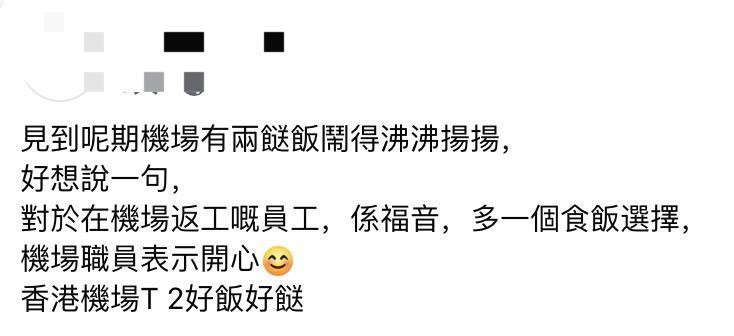 同时,也有更多声音指出,在机场开设两餸饭店是利于机场员工和旅客的事,不仅是一个向游客展示“香港名物”的好机会,而且也是为附近打工仔及旅客提供更多的餐食选择。