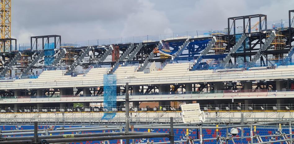 据现场报道,侧看台的一些模块已经完成建设,达到了未来球场的最高部分,再往上就是备受瞩目的穹顶结构。这一阶段的施工预计还将持续几天,之后将按照计划进入北看台的第三层建设阶段,随后是南看台和主看台区域的施工。