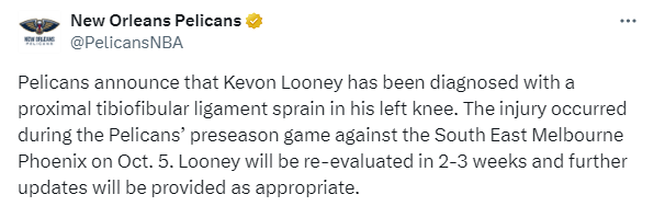 据悉,卢尼的受伤发生在10月6日鹈鹕队季前赛对阵东南墨尔本凤凰队的比赛中。当时,他在场上不慎受伤,随后被诊断为左膝近端胫腓韧带扭伤。根据鹈鹕队官方的声明,卢尼将在2-3周后接受重新评估,届时将发布进一步的信息。