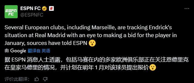 据ESPN权威报道,马赛俱乐部已就恩德里克一月租借的可能性向皇马进行了初步接触,而这并非皇马收到的唯一一份问价。随着冬季转会窗口的临近,皇马预计将收到更多关于这位巴西新星的租借报价。事实上,今年夏天皇马管理层就曾建议恩德里克外租以获得更多比赛经验,但球员本人坚持留队,希望能在阿隆索麾下证明自己的实力。