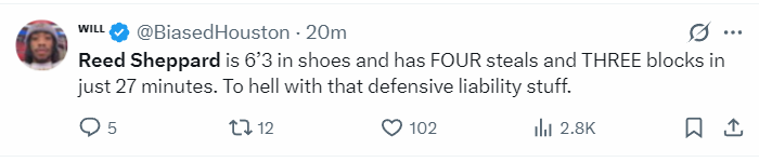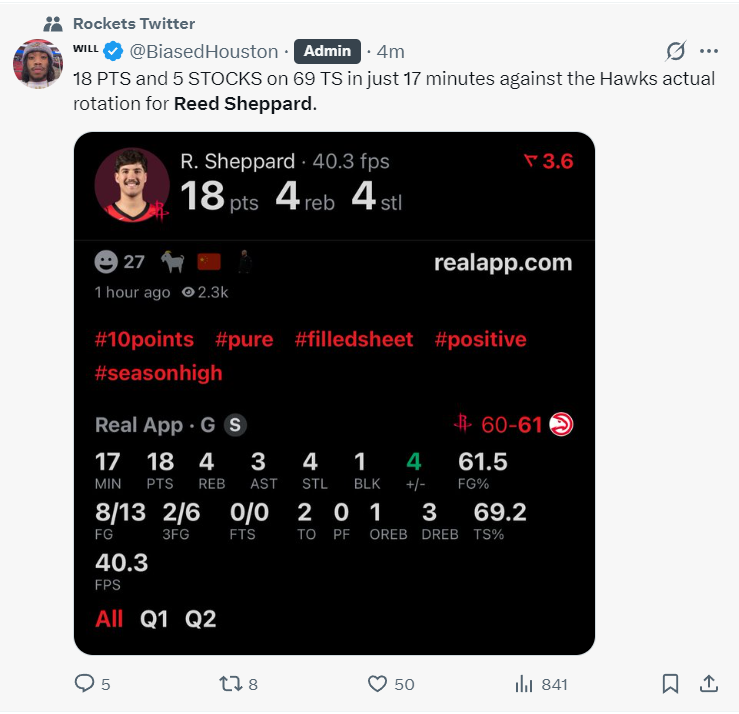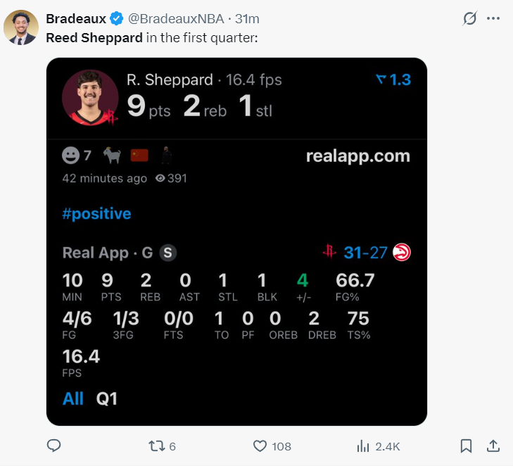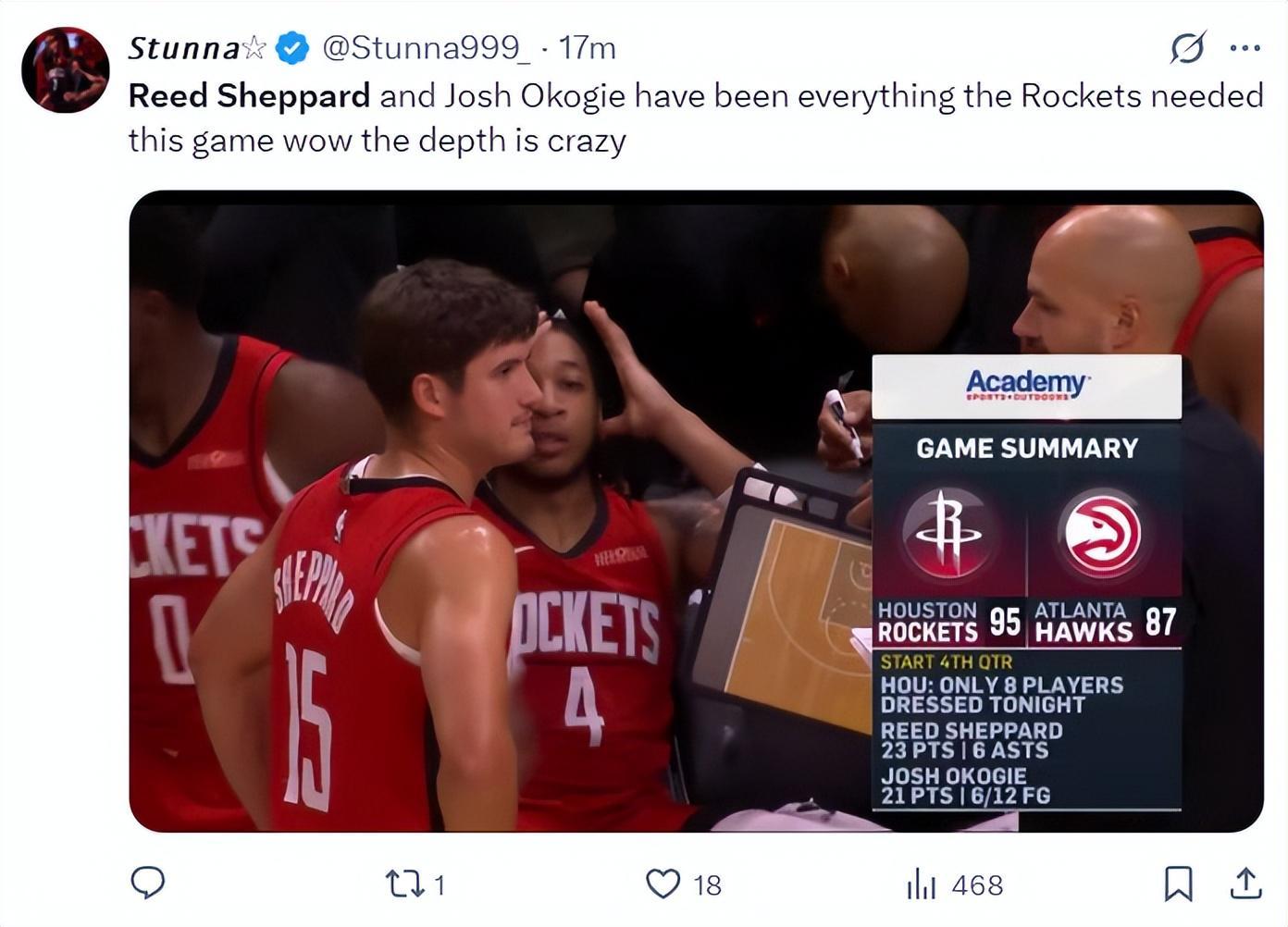 末节谢泼德延续火热手感,命中转换三分后被霍勒迪换下场。全场22投12中,三分13中5,砍下29分6篮板6助攻4抢断3盖帽,仅出现2次失误,命中率54.5%,三分命中率38.5%,真实命中率65.9%。下场时他露出灿烂笑容,显然对这场证明之战十分满意。