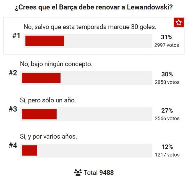 近日,《马卡》报就巴萨是否应该与莱万续约发起了一项网络调查,共有9488名球迷参与了投票。投票结果显示,球迷们的意见存在明显分歧:有30%的球迷认为,除非莱万本赛季能够打进30球,否则不应续约;另有30%的球迷则坚决表示,在任何情况下都不应与莱万续约;而27%的球迷认为可以续约,但只续一年;仅有12%的球迷支持与莱万续约好几年。