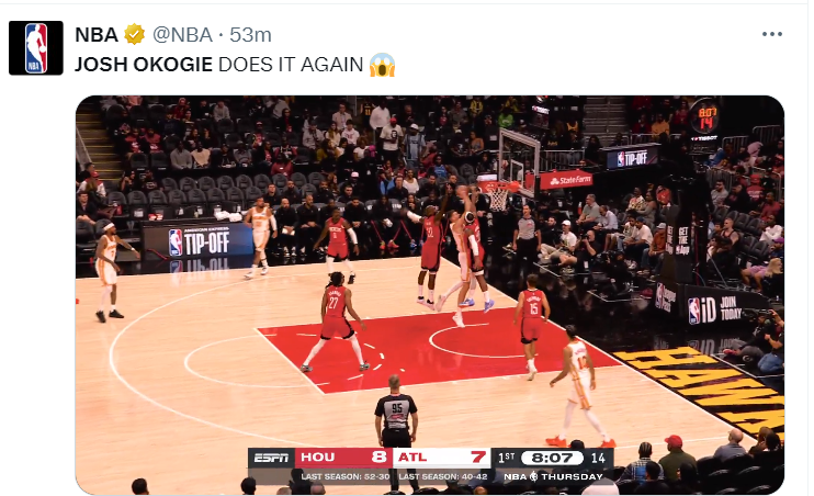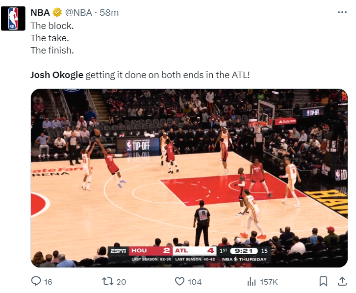 更令人惊叹的是,奥科吉在首节还成功封盖了身高2.21米的老鹰中锋波尔津吉斯,展现出超强的弹跳能力和防守覆盖范围。这位此前在黄蜂队机会有限的球员,在火箭体系下彻底释放了天赋。