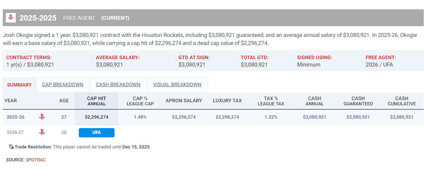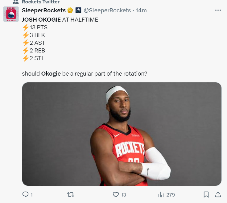 休斯顿当地媒体评价:"奥科吉本赛季对火箭的重要性远超预期,他用实际行动证明了自己是球队不可或缺的拼图。"