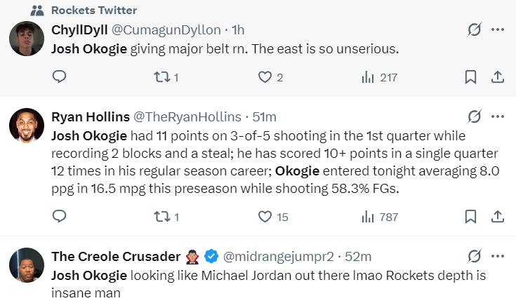 火箭球迷兴奋地表示:"奥科吉在火箭的表现让我想起了迈克尔·乔丹!这支球队的阵容深度太可怕了。"
