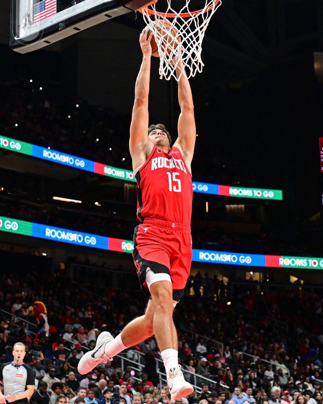 进攻端同样惊艳:次节5分45秒,他在三人合围下补篮得手;随后抢断肯纳德后完成暴扣;第三节更是连续封盖特雷·杨两次。当他在末节再中两记三分时,火箭已领先15分,教练组不得不提前换下这位"数据怪兽"。