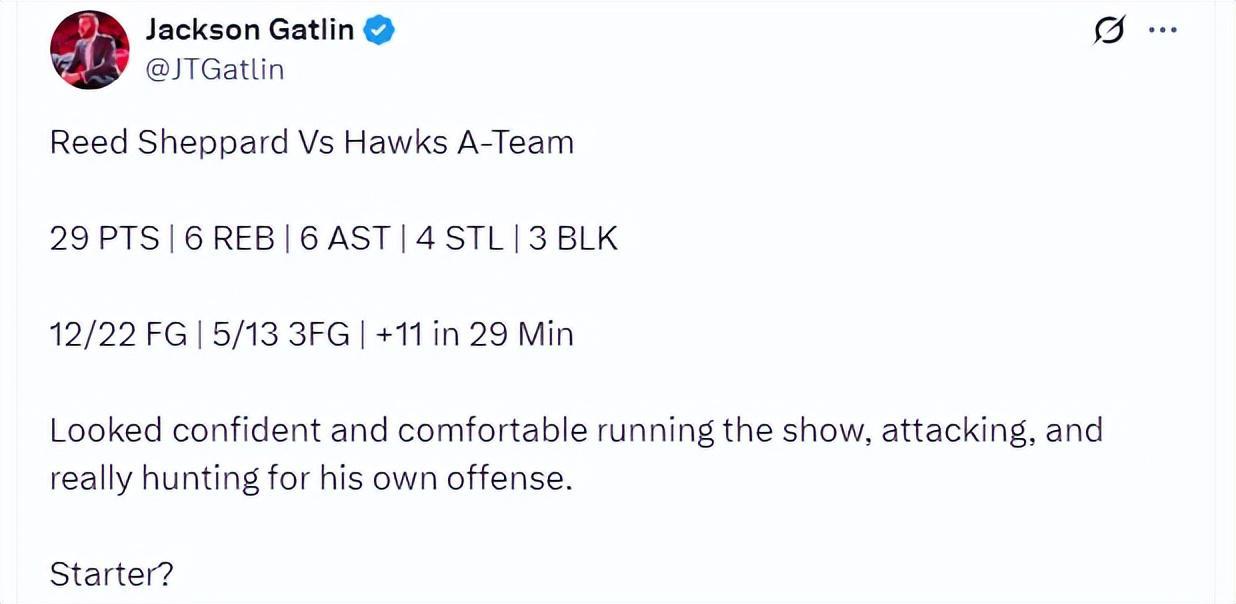 赛后,美媒RocketsMuse在推特晒出谢泼德的数据并配文:"第五位首发球员?"NBA记者杰克逊·加特林更直言:"他在掌控比赛、突破进攻和主动寻找得分机会时,显得非常自信从容。首发位置该给他吗?"