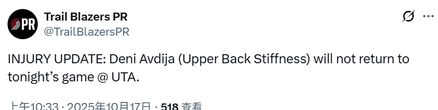 据开拓者队医团队及教练组联合确认,主力球员德尼·阿夫迪亚因上背部肌肉僵硬问题,经现场评估后决定退出本场比赛剩余时段。医疗组表示该伤势属于急性肌肉痉挛,为预防进一步损伤采取保护性措施。