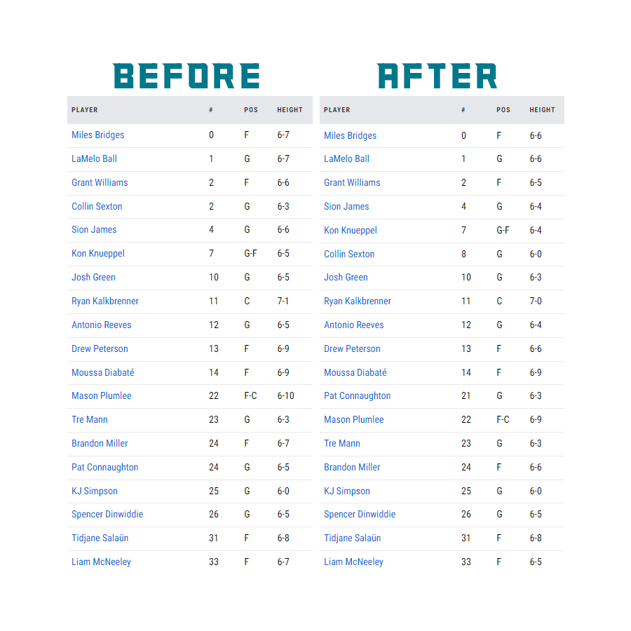 除了塞克斯顿之外,黄蜂队还有其他6名球员的身高也出现了调整。具体调整情况如下: