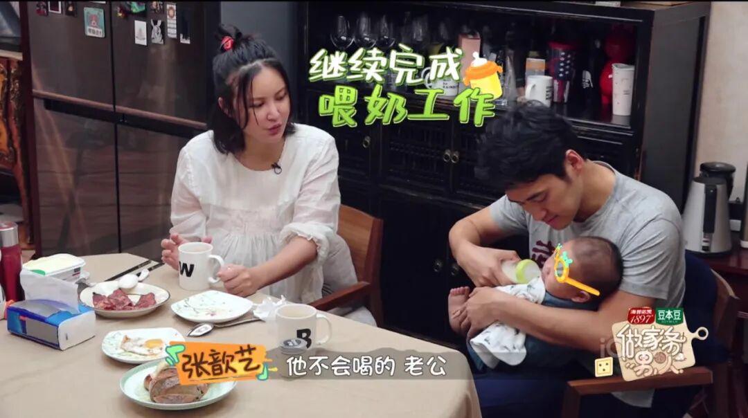 张歆艺吃早饭,袁弘就在一边给孩子喂奶