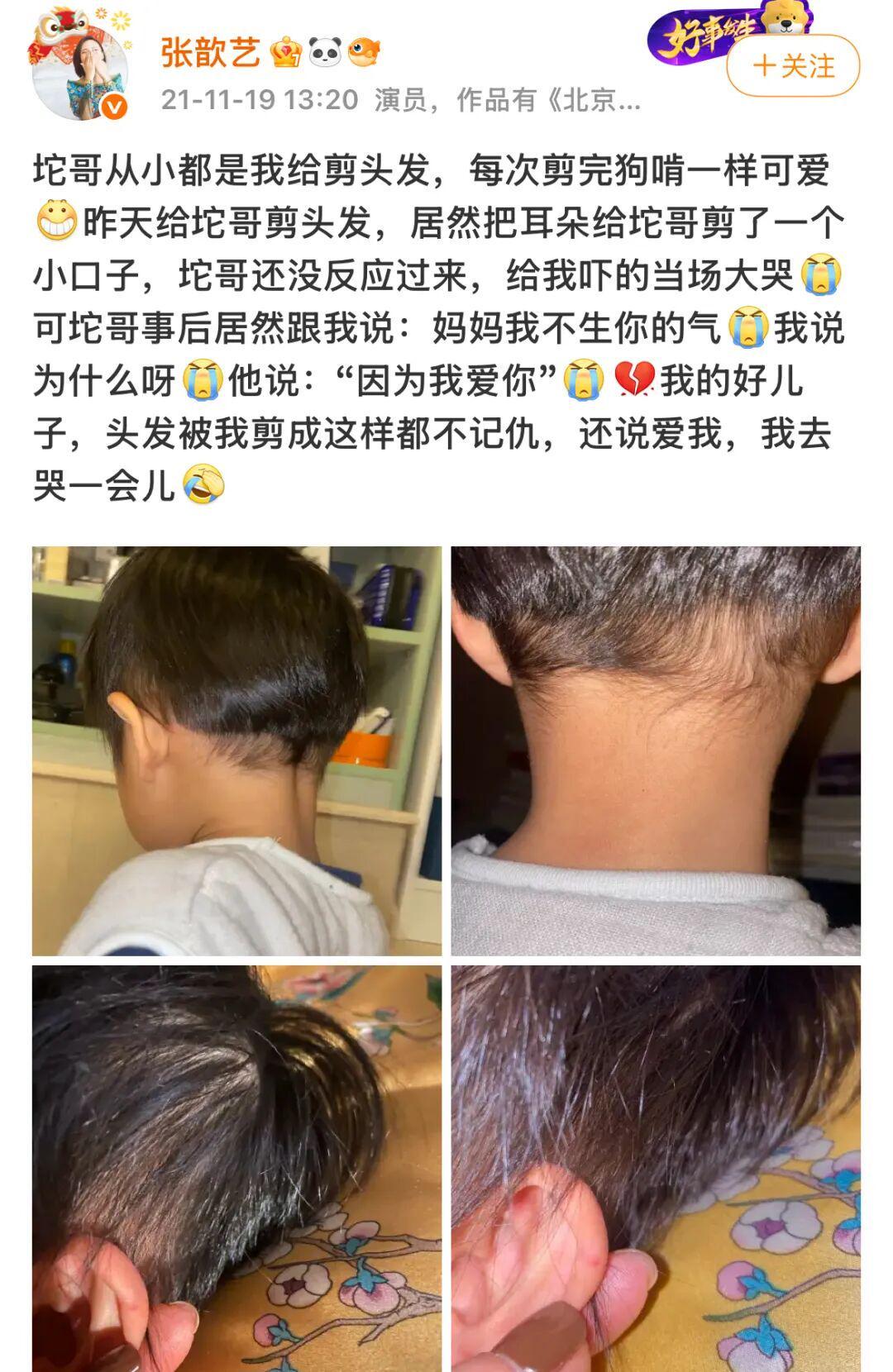 剪头发张歆艺不小心给四坨的耳朵剪了个小口子,