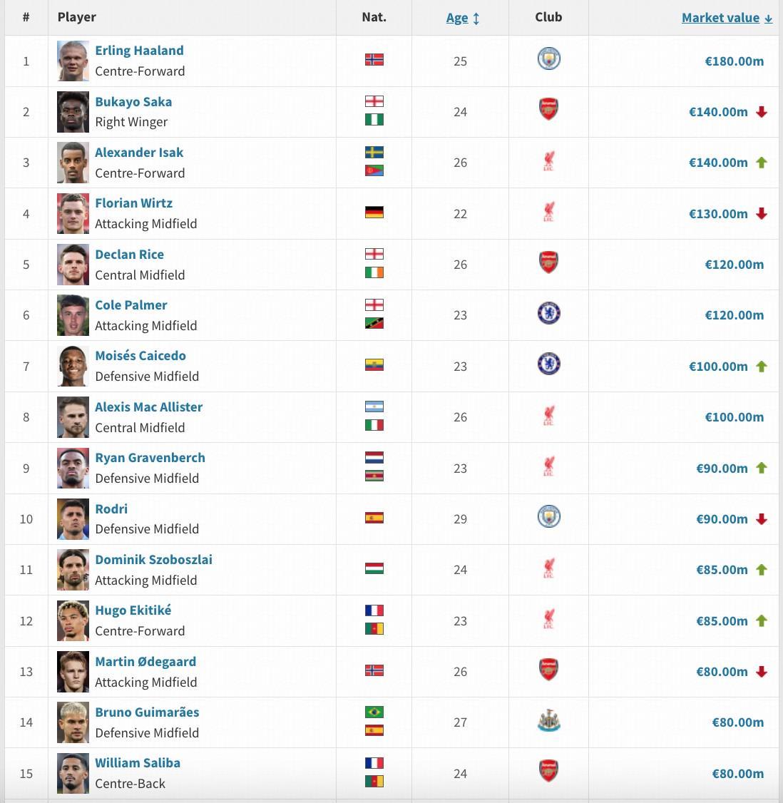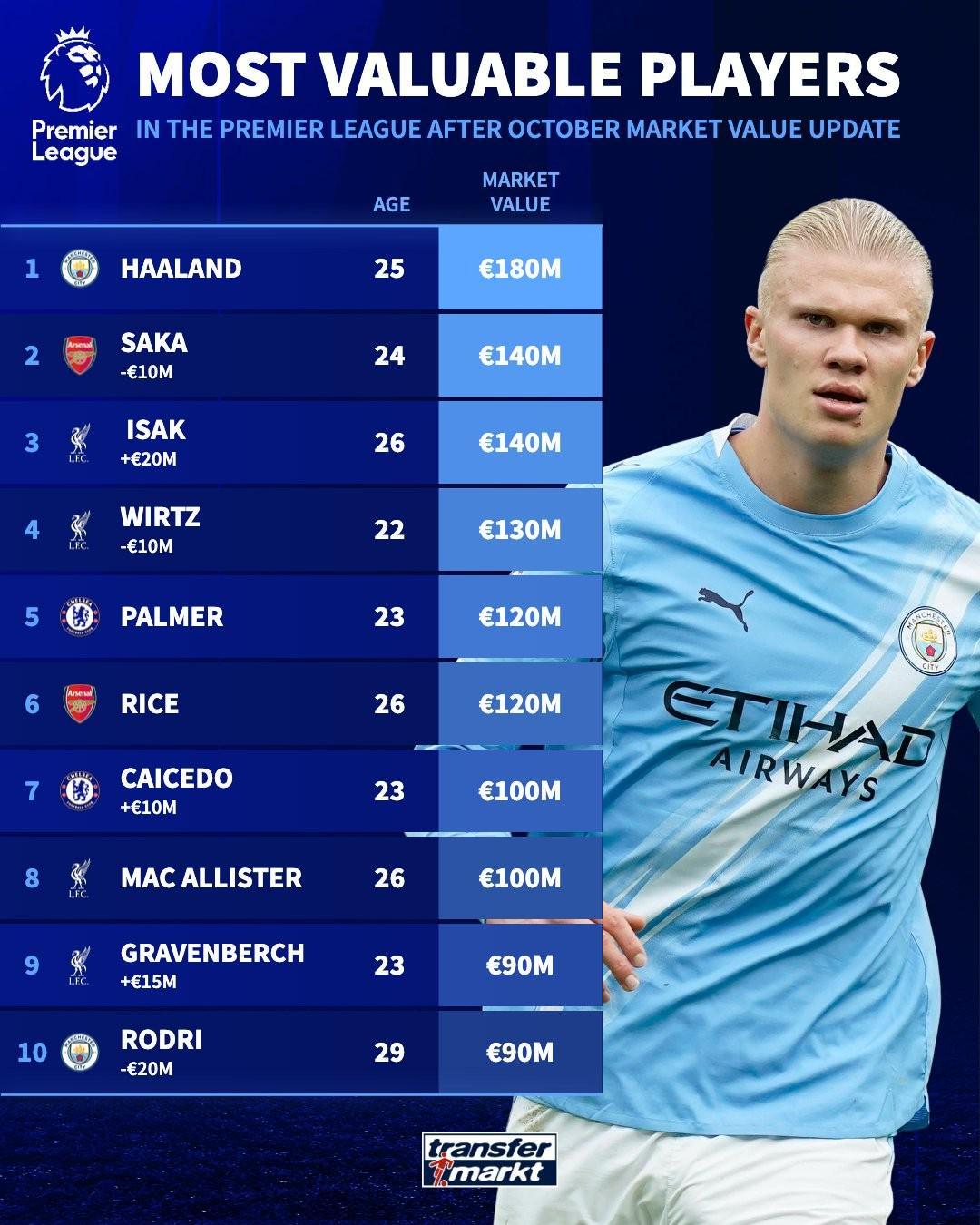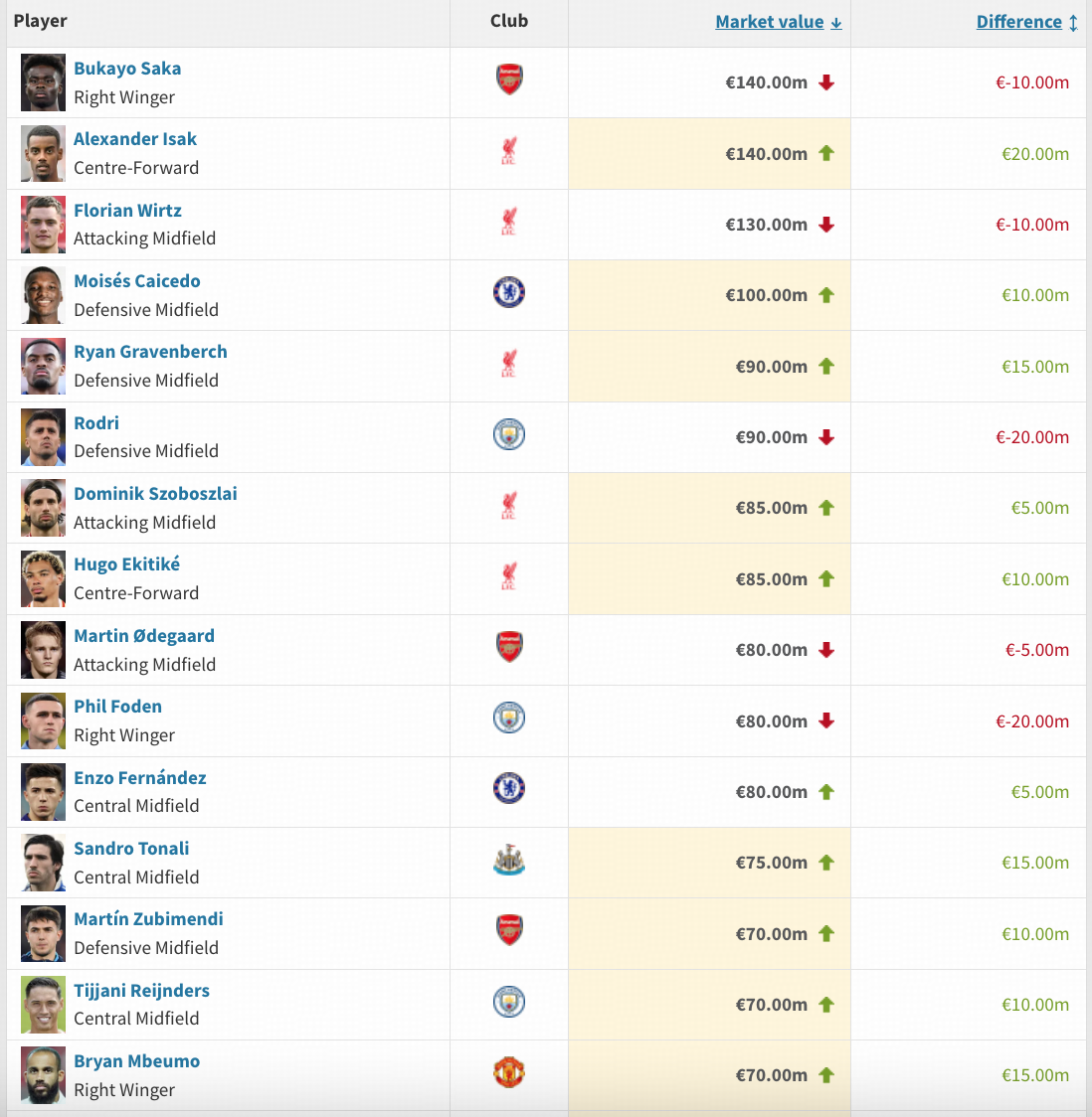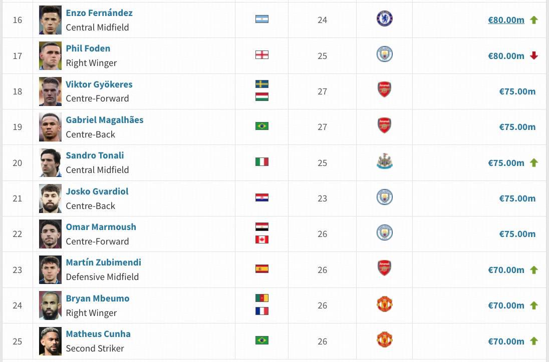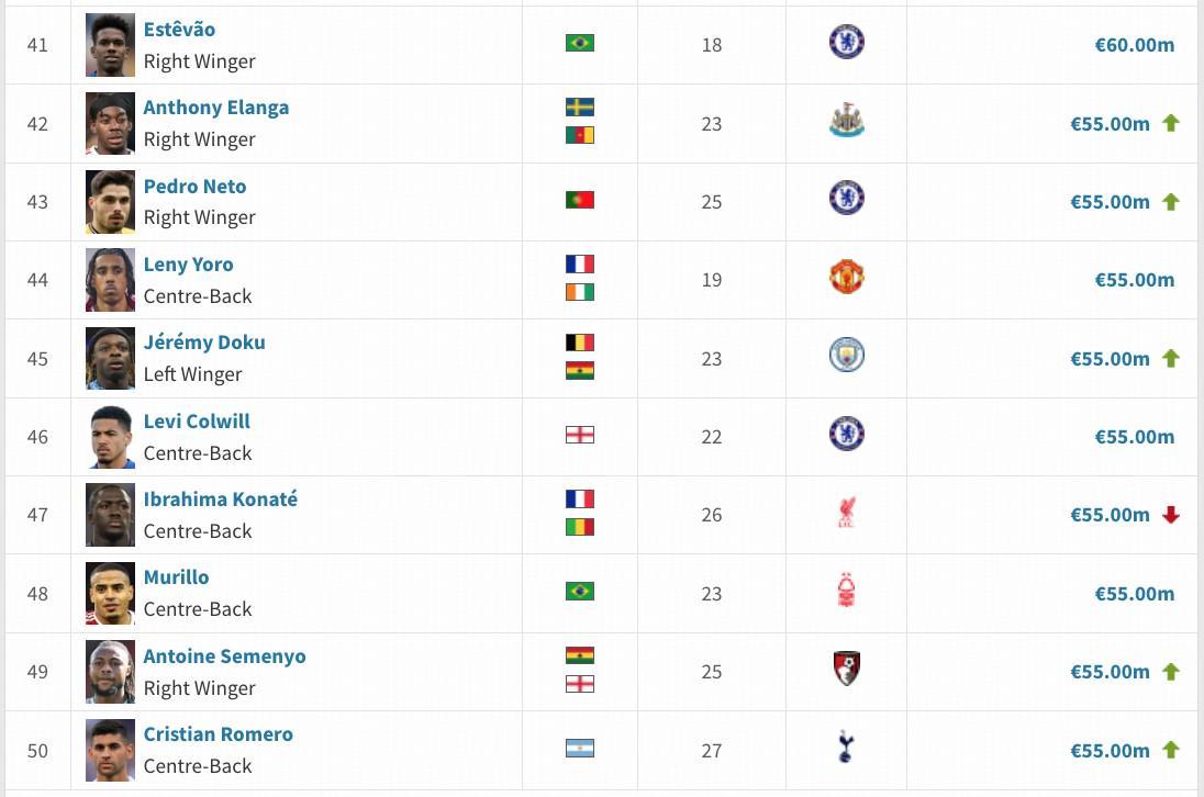 英超身价TOP50球员名单则更加全面地展示了联赛中各位球员的身价情况:
