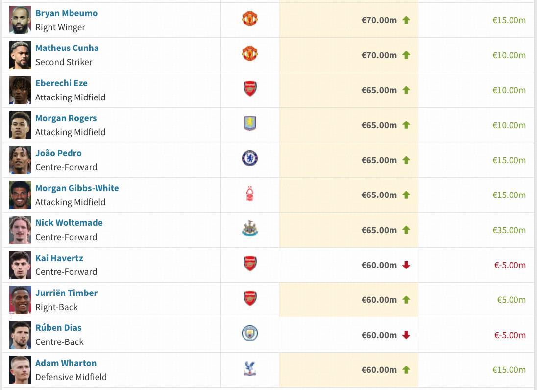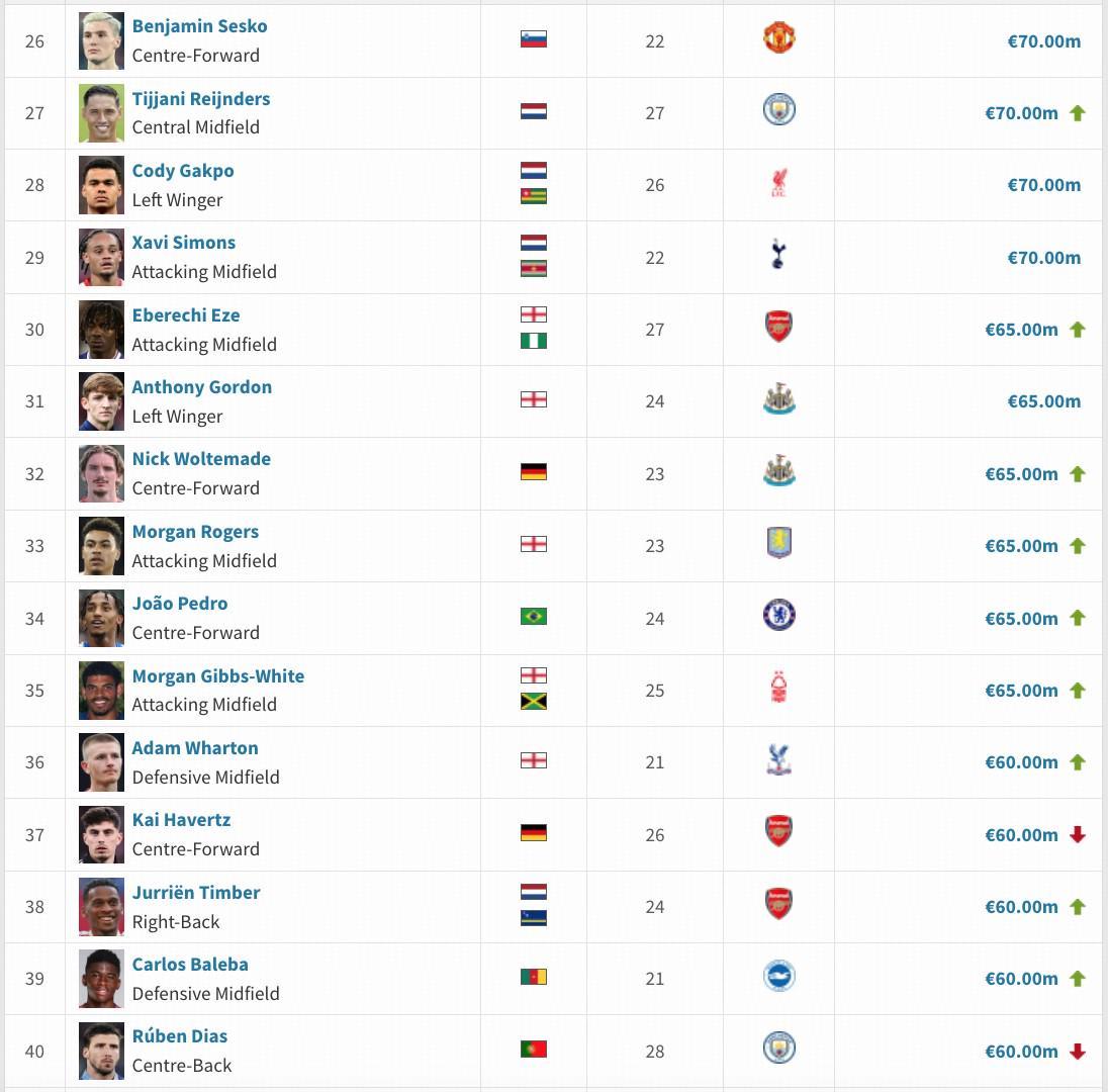 本期英超重点身价变更中,除了维尔茨、萨卡和凯塞多的身价变动外,还有其他球员的身价也发生了显著变化。以下是部分重点身价变更信息: