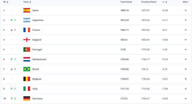 FIFA最新排名揭晓:西班牙登顶榜首,德国强势回归前十